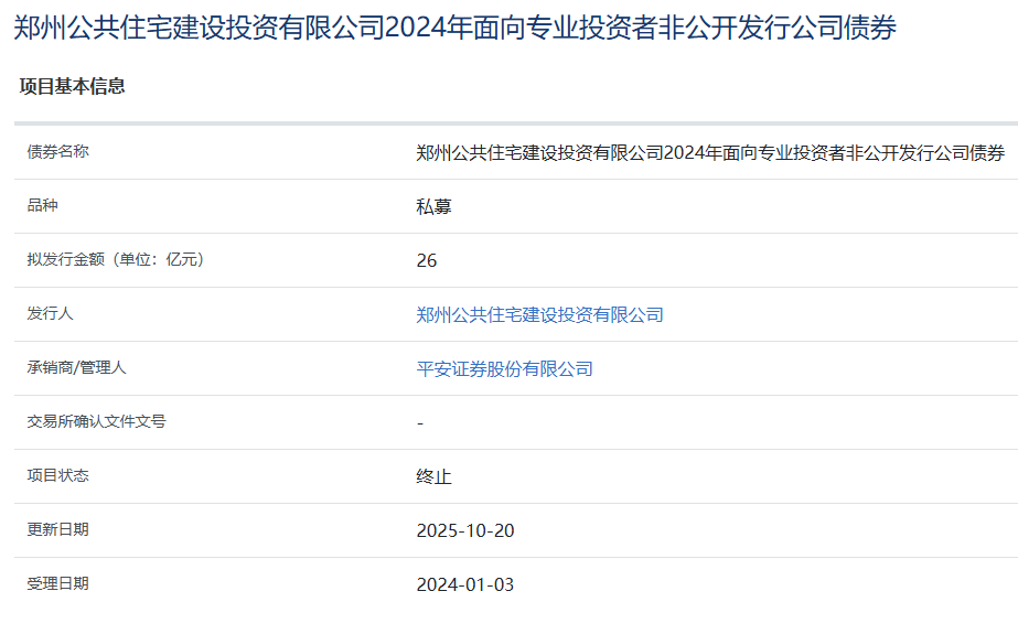 【大河财立方消息】10月20日,郑州公共住宅建设投资有限公司2024年面向专业投资者非公开发行公司债券项目状态更新为“终止”。该债券拟发行金额26亿元,承销商/管理人平安证券。受理日期为2024年1月3日。